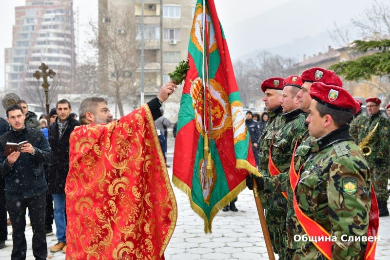 Гордеем се като нация, че знамената на Българската армия не са пленявани в нито една битка досега. По стара традиция, идваща още от времето на Първата българска държава, на Йордановден се благославят и освещават българските знамена”. Това заяви днес кметът Стефан Радев по време на освещаването на бойните знамена на Център за подготовка на специалисти - Сливен. На тържествения ритуал, състоял се на площад ,,Панайот Хитов”, кметът поздрави командира на Центъра полк. Любомир Вачев, и пожела на всички, които служат под Националния флаг здраве, много вяра и енергия, с която достойно да продължават да изпълняват свещения си дълг. Освещаването на знамената извърши отец Силвестър Янакиев.