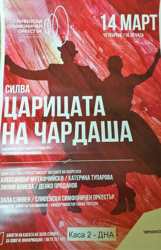 На сцената на зала „Сливен“ в четвъртък ще бъде представена оперетата „Царицата на чардаша“. Спектакълът ще изнесат Сливенският симфоничен оркестър и звездите на оперетата Александър Мутафчийски, Катерина Тупарова, Лилия Илиева и Денко Проданов. Концертът ще започне в 18.30 часа и ще премине под диригентството на маестро Димитър Караминков, с концертмайстор Силва Топузян.