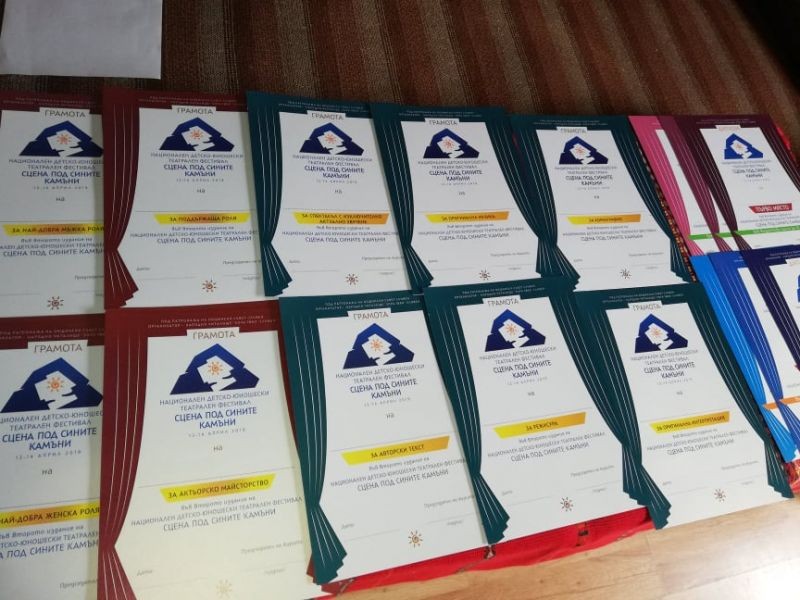 Десет индивидуални награди в различни категории, колективни награди в две възрастови групи, специална награда на журито и гран при ще бъдат връчени на победителите във втория Национален детско - юношески театрален фестивал "Сцена под Сините камъни" в Сливен /12 – 14 април/. Това съобщи Галя Георгиева, секретар на НЧ „Зора 1860“, организатор на фестивала. Всички деца ще получат грамоти за участие, книги и сувенири с логото на Община Сливен.