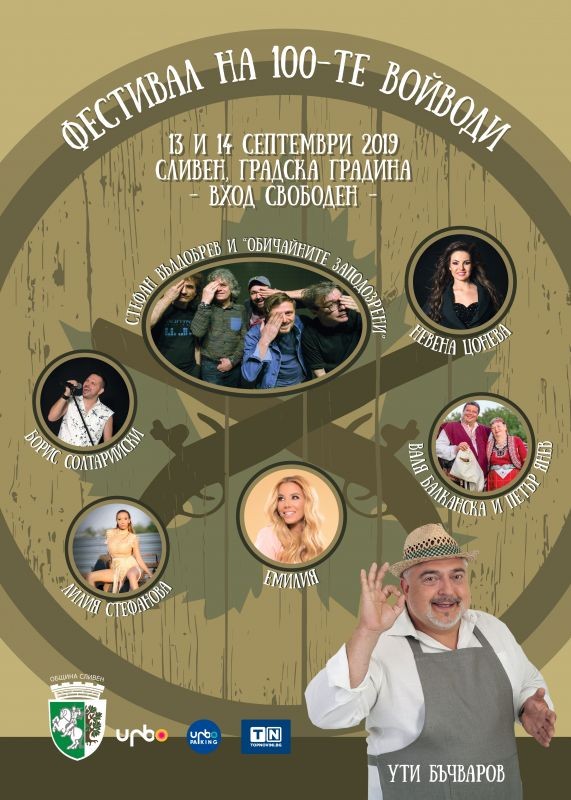 20 местни фирми ще участват в петото издание на „Фестивала на 100-те войводи“, който ще се проведе на 13 и 14 септември в Сливен. На шатрите, които ще бъдат разположени в Градската градина, ще се предлагат първокачествени местни продукти – колбаси, сирене, кашкавал, мед и др. За първи път тази година местен производител на лютеница и пюрета се включва в проявата. Началото на фестивала е на 13 септември от 18 часа с кулинарно шоу на Ути Бъчваров. Следва програма на самодейни състави от общината, а от 20 часа на сцената ще се качи голямата Валя Балканска с гайдаря Петър Янев. От 21 часа са изпълненията на Стефан Вълдобрев и „Обичайните заподозрени“. В събота програмата ще започне от 11 часа с куклен театър за най-малките. От 18 часа – изяви на самодейни състави, след което ще звучат песни на Куку-бенд. От 21,30 ч. започва концерт на Емилия.