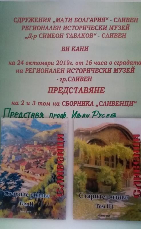 На 24 октомври от 16 часа в Регионалния исторически музей „Д-р Симеон Табаков“ ще се състои премиерата на том 2 и 3 от документалната поредица „Сливенци. Старите родове“ – издание на сдружение „Мати Болгария“. Историкът проф. Иван Русев ще представи пред присъстващите двете нови издания на „Мати Болгария“, посветени на родовата памет на Сливен. Представянето на тазгодишните издания на „Мати Боолгария“ е включено в честването на патронния празник на Сливен Димитровден.