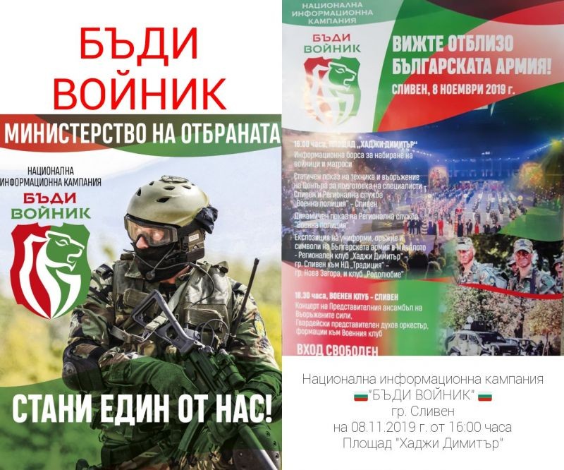 Сливен е домакин на 8.11.2019 г. (петък) на националната информационна кампания на Министерството на отбраната за популяризиране на военната професия, която е под надслов „Бъди войник“.