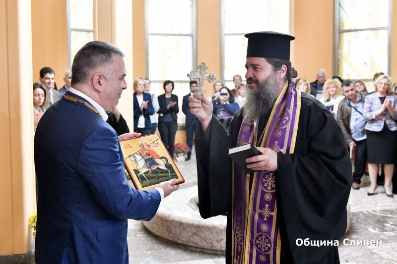 Отец Евгений Янакиев отслужи молитва за здраве и благополучие. От името на Негово Високопреосвещенство Сливенския Митрополит Иоаникий и Сливенската Митрополия той подари на кмета икона на свети Мина.