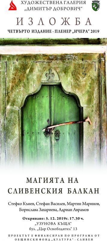 Изложбата "Магията на Сливенския Балкан" ще представи на вниманието на изкушените от визуалните изкуства творбите, създадени по време на последното 4-то издание на едноименния пленер, пресъздаващи впечатленията и емоциите на няколко поколения даровити художници, породени от "сблъсъка" с духа и традициите на сливенското село Ичера. Тази година участници в художествената инициатива са: Мартин Маринов, Борислава Захариева, Адриан Аврамов, Стефко Кънев и Стефан Василев.