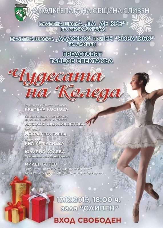 Община Сливен кани всички жители и гости на града на коледен балетен спектакъл „Чудесата на Коледа“. В него участват над 140 деца и подрастващи, възпитаници на балетна школа „Адажио“ при Народно читалище „Зора – 1860“-Сливен с ръководител Наталия Хаджикостова и балетна школа „Па де Кре“-Стара Загора с ръководител Кремена Костова.