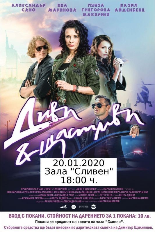 В началото на следващата седмица ще се състои премиерата на новия български филм „Диви и щастливи“. Денят е понеделник, мястото е зала „Сливен“, а началният час е 18 часа. Входът ще бъде с покани, които след 15 ч. днес ще бъдат в пуснати в продажба на касата на зала „Сливен“. Средствата ще бъдат преведени в полза на 20-годишния Димитър Щилиянов от Сливен, който страда от тежко заболяване.