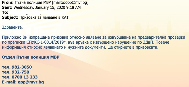 ГДБОП предупреждава за активна СПАМ атака спрямо гражданите, а целта е заразяване на компютърни конфигурации и смарт устройства. Както и при предишни подобни атаки, се използва името на държавна институция - в случая Министерството на вътрешните работи. Съобщенията се изпращат от електронен пощенски адрес: opp@mvr.bg, наименован „Пътна полиция МВР“, и съдържат прикачен файл, за който се претендира, че е електронен ФИШ от КАТ или призовка за извършено друго нарушение по Закона за движение по пътищата.