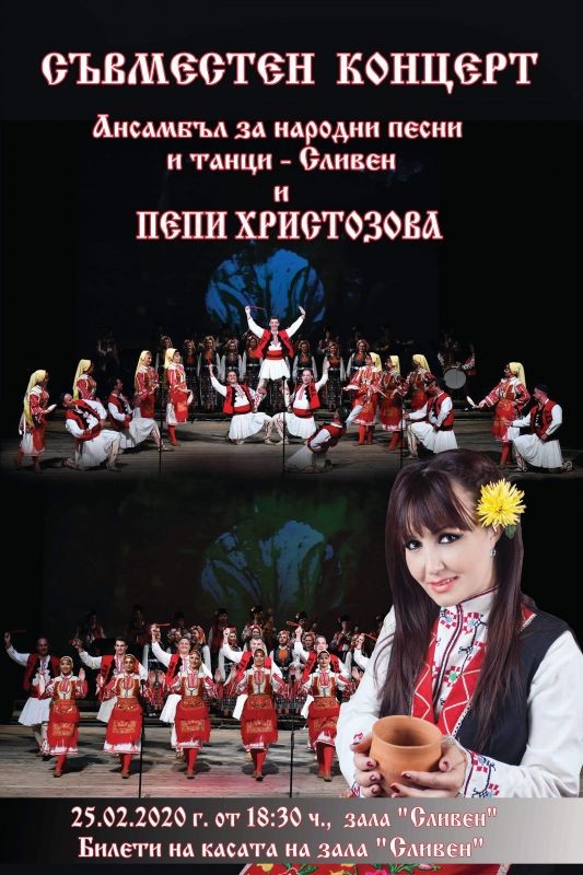 Съвместен концерт събира на една сцена Ансамбъла за народни песни и танци – Сливен и талантливата народна певица Пепи Христозова. Събитието ще се проведе на 25 февруари в зала „Сливен“. Началото на съвместната проява е от 18.30 часа. Билети могат да бъдат закупени на касата на зала „Сливен, чието работно време е : сутрин – от 10 до 13 ч. , следобед – от 15 до 18 часа.
