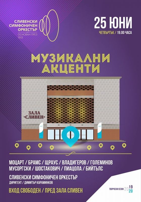 На открито, пред зала „Сливен“ ще бъдат представени произведения от Моцарт, Брамс, Щраус, Владигеров, Големинов, Мусоргски, Шостакович, Пиацола и „Бийтълс“.