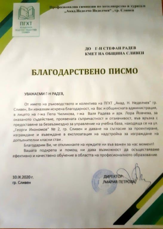 В благодарствено писмо до кмета Стефан Радев ръководството и колективът на Професионална гимназия по хотелиерство и туризъм „Акад. Неделчо Неделчев“ изразява признателността си за бъзвъзмездно предоставената учебна база от Общината, където ще бъдат изградени допълнителни класни стаи към гимназията.