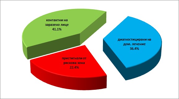 На диаграмата: Относителният дял на поставените под карантина лица - 664 души, от които 149 са пристигнали от рискова зона, 273 са контактните, останалите са болни, чието лечение се провежда под наблюдението на личните лекари. Диаграмата е изготвена от ОД на МВР - Сливен.