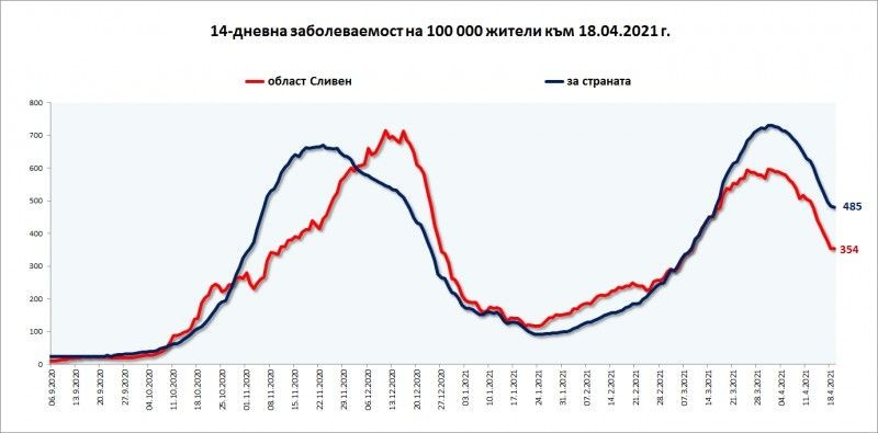 Заболеваемостта за поредна седмица остава значително по-ниска от средната за страната. До 18 април статистиката отчита 354 души на 100 хил.души население в областта при средна стойност за страната от 485, съобщиха от Областния кризисен щаб.