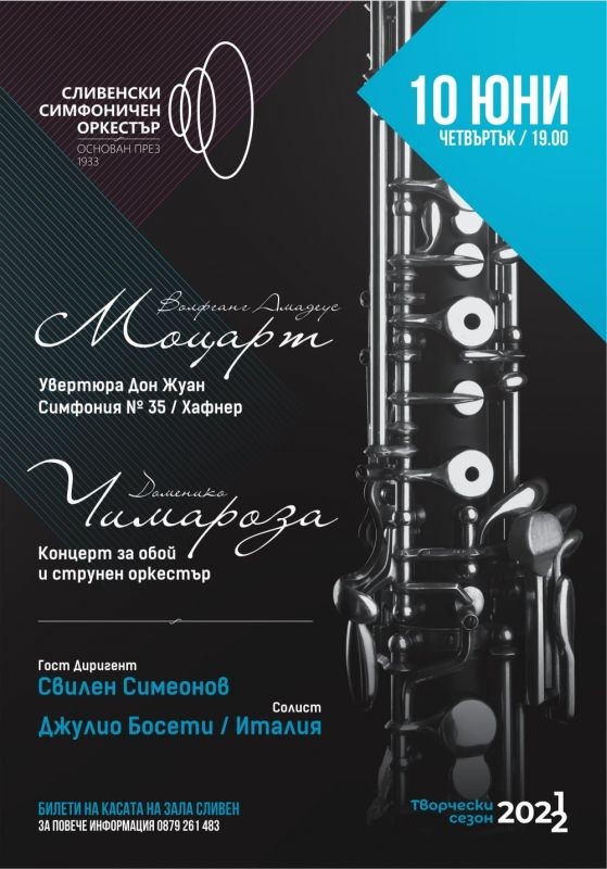 Творческият сезон на Сливенския симфоничен оркестър продължава с концерт на 10 юни, четвъртък. За почитателите на класическата музика на сцената на зала „Сливен“ ще звучат произведения от Волфганг Амадеус Моцарт и Доменико Чимароза. Гост-диригент на вечерта ще бъде Свилен Симеонов, а като солист ще се изяви Джулио Босети, обой.