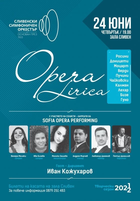 „Opera Lirica“ – Концерт с участието на солисти-лауреати на „Sofia Opera Performing“ ще изнесе Сливенският симфоничен оркестър на 24 юни. Почитателите на класическата музика ще имат възможност да чуят произведения от Моцарт, Росини, Доницети, Верди, Чайковски, Калман, Лехар, Бизе и Гуно. Класическите творби ще бъдат в изпълнение на сопраните Венера Мелеки и Ива Бизева, мецосопрана Моника Зашева, тенорите Андрея Мирчев и Любомир Дамянов. Сред солистите-лауреати участие ще вземе и баритонът Петър Данаилов. Концертната вечер в зала „Сливен“ ще премине под диригентството на маестро Иван Кожухаров. Началният час е 19 часа. Билети могат да бъдат закупени на касата на зала „Сливен“.