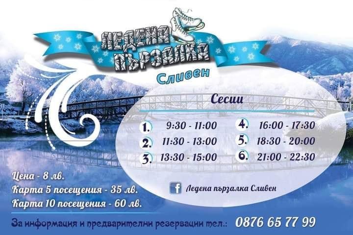И тази година Община Сливен инициира монтажа на ледена пързалка за жителите и гости на града. Мобилното съоръжение е позиционирано на паркинга пред изложбена зала „Сирак Скитник“ и мол City Centre Sliven, и от утре, 4 декември, вече ще бъде достъпно за посетители. Предвид наложените противоепидемични мерки, посещенията ще се извършват на сесии – от 9.30 до 11 ч.; от 11.30 до 13 ч.; от 13.30 до 15 ч.; от 16 до 17.30 ч. от 18.30 до 20 ч. и от 21 до 22.30 ч.
