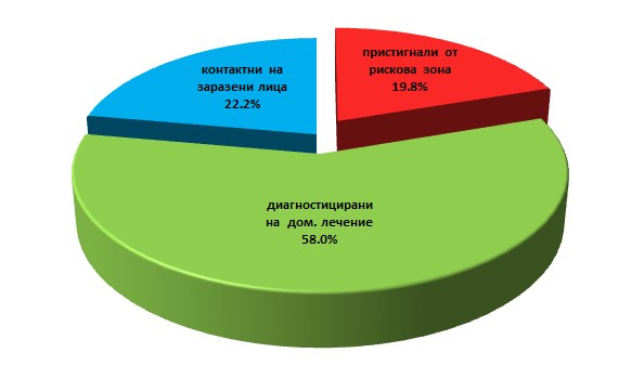 Под карантина са 1 085 лица. Повечето от тях – 58%, са болни, чието лечение се провежда в домашна изолация под наблюдението на личните лекари. Останалите карантинирани са контактни на заразени или са пристигнали от рискови зони.