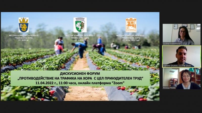 С цел надграждане на регионалните политики за превенция на престъплението трафик на хора, предотвратяване на трудовата експлоатация и взаимодействие с академичната общност, секретарите на Местните комисии за борба с трафика на хора (МКБТХ) в Сливен, Бургас и Благоевград проведоха дискусионен форум на тема „Противодействие на трафика на хора с цел принудителен труд”.