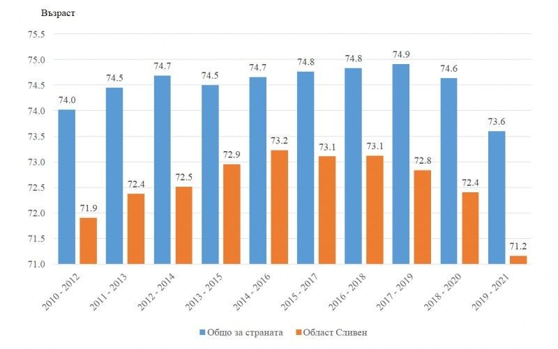 Очакваната средна продължителност на предстоящия живот общо за населението на област Сливен, изчислена за периода 2019 - 2021 г. е 71.2 години, като спрямо предходния период (2018 – 2020 г.) тя намалява с 1.2 години. Средната продължителност на живота в областта е с 2.4 години по-ниска от средната за страната - 73.6 години.