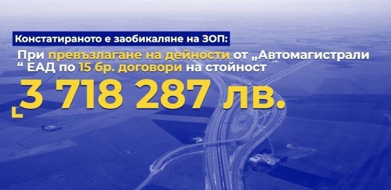 Констатираното е заобикаляне на ЗОП при превъзлагането на дейности от „Автомагистрали“ ЕАД по 15 бр. договори за проектиране на стойност 3 718 287 лв. То не е санкционирано, защото обект на проверката е АПИ, а не „Автомагистрали“ ЕАД, което е извършвало превъзлаганията. В хода на инспекцията от АПИ писмено са заявили, че не са запознати с договори за превъзлагане, които е сключвало „Автомагистрали“ ЕАД. Това от своя страна е наложило с указание от наблюдаващия прокурор да се извърши единствено насрещна проверка дружеството за преглед на налична документация.