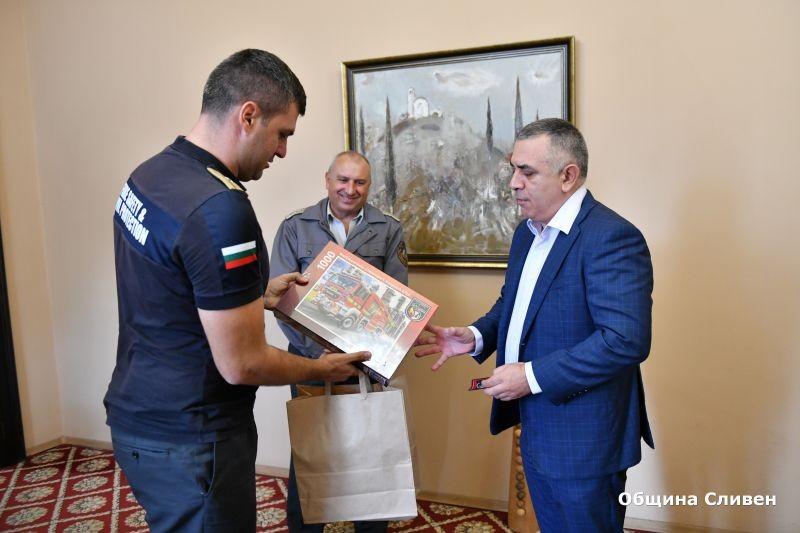 На среща днес кметът Стефан Радев беше запознат от директора на Регионална дирекция „Пожарна безопасност и защита на населението“ комисар Владимир Демирев с модификацията на машината. Бяха обсъдени и впечатленията от престоя на сливенските огнеборци в немската противопожарна служба. От свое име и от името на колегите си, комисар Демирев изказа благодарност към Община Сливен, която е финансирала транспортирането на автомобила до България. От името на своя колега и началник на пожарната в Кьолн Ралф Ласман, той връчи на кмета Радев емблема на немската пожарна и тематични подаръци. Сливенският градоначалник благодари за жеста и вниманието, като подчерта, че новата придобивка ще е в помощ на жителите на общината и служителите на пожарната. Той изпрати благодарствен адрес за дарението до противопожарната служба в Кьолн.