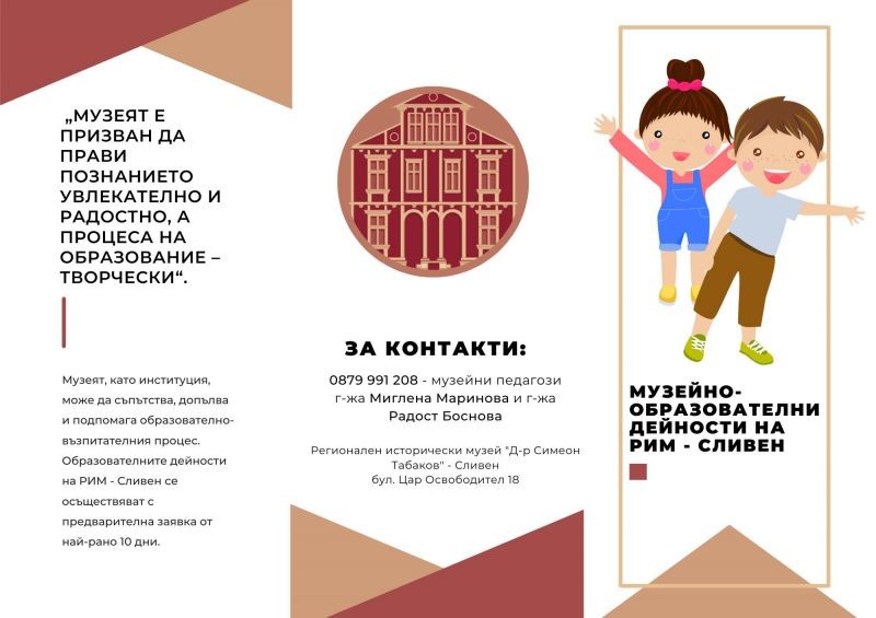 Музейно образователната програма на Регионален исторически музей – Сливен има за цел да осигури пространство, в което всички деца да бъдат приобщени, да съпреживеят и да се докоснат до културно-историческото ни наследство. В музея работи екип от двама специалисти, единият от които е психолог и логопед с опит в работата с деца.