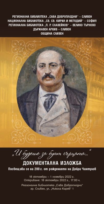 На 18 октомври, от 17:00 часа, в централното фоайе на Регионална библиотека „Сава Доброплодни“-Сливен ще бъде открита документалната изложба „И будеше за бунт сърцата…”, посветена на 200г. от рождението на Добри Чинтулов - една от най-значимите фигури на Българското възраждане - заслужил учител, забележителен педагог, изключителен патриот и родолюбец, бележит общественик и борец за църковна независимост, вдъхновен бунтовен поет. В своята поезия Чинтулов става изразител на страстния и кипящ порив на българския народ за свобода. Песните му се приемат като откровение, като зов за борба и разпалват бунтовните пориви на българите, а с искрения патриотичен патос, с ярката героична романтика, с живата поетична образност, с народно-литературния език и ритмичния стих те полагат и началото на нашата нова поезия.