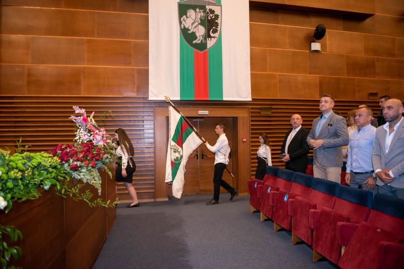 С внасяне на знамето на Общината в зала „Сливен“ днес започна 39-ата тържествената сесия на местния парламент. Тя е посветена на празника на Сливен – Димитровден.
