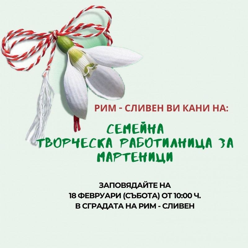 На 18 февруари (събота), от 10:00 ч. до 12:00 ч., в сградата на Регионалния исторически музей "Д-р Симеон Табаков" – Сливен ще се проведе семейна творческа работилница за мартеници. Участниците ще се запознаят с традиционните вярвания, обичаи и представи, свързани с 1-ви март. Заедно с музейните ни педагози, децата и техните родители ще могат да проявят творчество и да изработят свои мартеници.