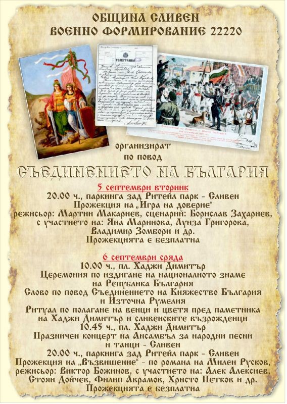 В Деня на Съединението, жители и гости на Сливен ще имат възможност да се включат в общоградската церемония на пл. „Хаджи Димитър“ по повод празника. Тя ще започне от 10 ч. с издигане на националния флаг на Република България и ще завърши с поднасяне на венци и цветя пред паметника на Хаджи Димитър и сливенските възрожденци. Програмата на централния площад ще продължи с празничен концерт на артистите от сливенския Ансамбъл за народни песни и танци. Началото е предвидено за 10.45 ч.