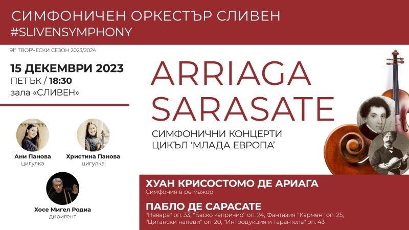 Сливенският симфоничен оркестър ще представи първия за сезона концерт, който е от цикъла „Млада Европа“. В зала „Сливен“ ще звучи музиката на Хуан Крисостомо Ариага и Пабло де Сарасате. Участие ще вземат младите цигуларки – сестрите Ани и Христина Панови. Спектакълът ще бъде под диригентството на маестро Хосе Мигел Родиа от Испания.