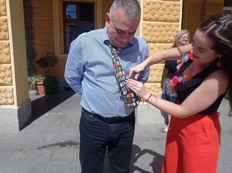 Възпитаниците на училището подариха десетки усмивки на случайните минувачи. Те изненадаха и кмета Стефан Радев, който слезе при тях, за да ги поздрави за прекрасната инициатива. Оказва се, че на този празник, жените режат вратовръзките на мъжете, за да им покажат своята „нежна сила“. И по този повод една от ученичките на гимназията отряза вратовръзката на кмета.