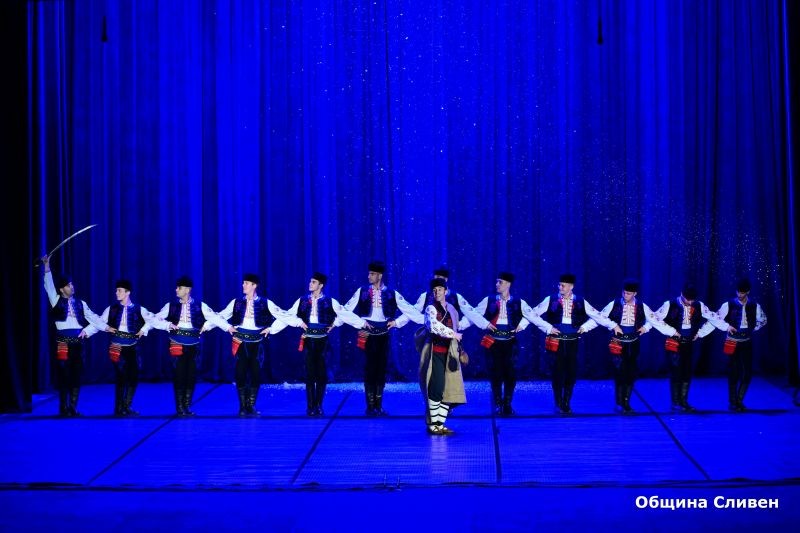 Вечерта започна с концерт-спектакъл „Обичаите на България“ на Национален фолклорен ансамбъл „Българе“. Събитието препълни голямата зала на Драматичен театър „Стефан Киров“. Артистите пресъздадоха по свой начин различни обичаи от бита на българите като коледуване, лазарки, крадене на булка, Гергьовден, Прошка и обичаите на Сирни Заговезни. Концертът завърши със сливенска сватба по Димитровден, а зрителите дълго аплодираха на крака невероятния талант на хореографите. Цветя бяха поднесени от името на кмета Стефан Радев, председателя на Общински съвет-Сливен Димитър Митев и от областния управител Чавдар Божурски.