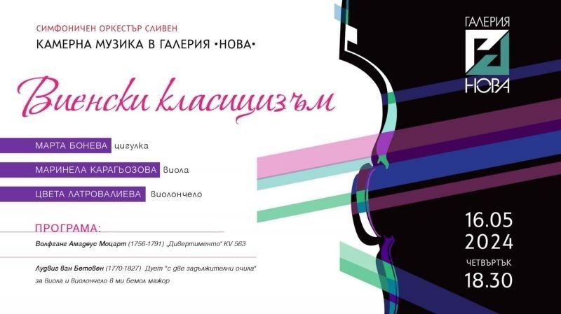 Завършва концертният цикъл „Камерна музика в галерия „Нова““ в сътрудничество между Симфоничен Оркестър-Сливен и Национална художествена гимназия „Димитър Добрович“-Сливен. Последното събитие, под надслов „Виенски класицизъм“ ще се проведе в на 16 май от 18.30 часа в галерия „Нова“.