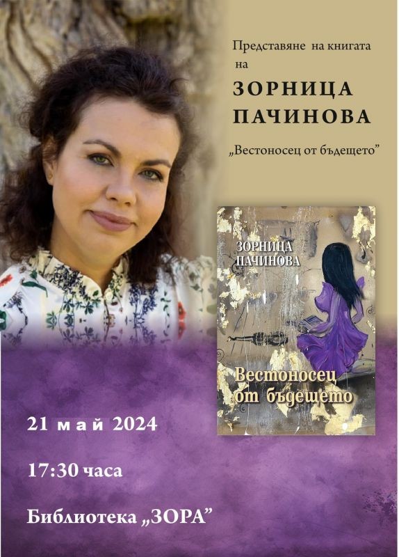 Представяне на книгата„Вестоносец от бъдещето” от ЗОРНИЦА ПАЧИНОВА – 21 май 2024 г., 17:30 часа, Библиотека „ЗОРА”.