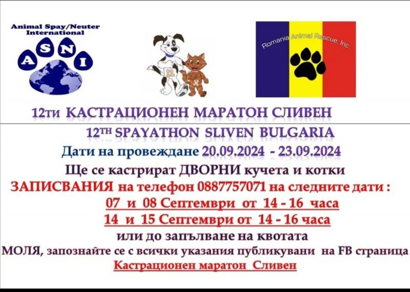 На 20 септември започва XII кастрационен маратон в Сливен. В дните до 23 септември ще се кастрират безплатно дворни кучета и котки. Записванията стават предварително на телефон 0887 775 071 на следните дати: