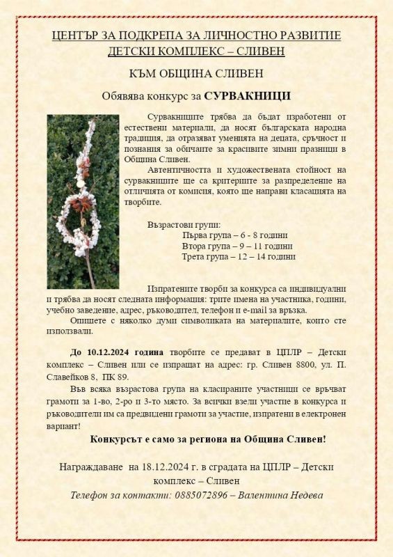 Сливенският Център за подкрепа за личностно развитие - Детски комплекс организира конкурс за сурвакници. Те трябва да бъдат изработени от естествени материали, да носят българската народна традиция, да отразяват уменията на децата, сръчност и познания за обичаите, за красивите зимни празници в община Сливен.