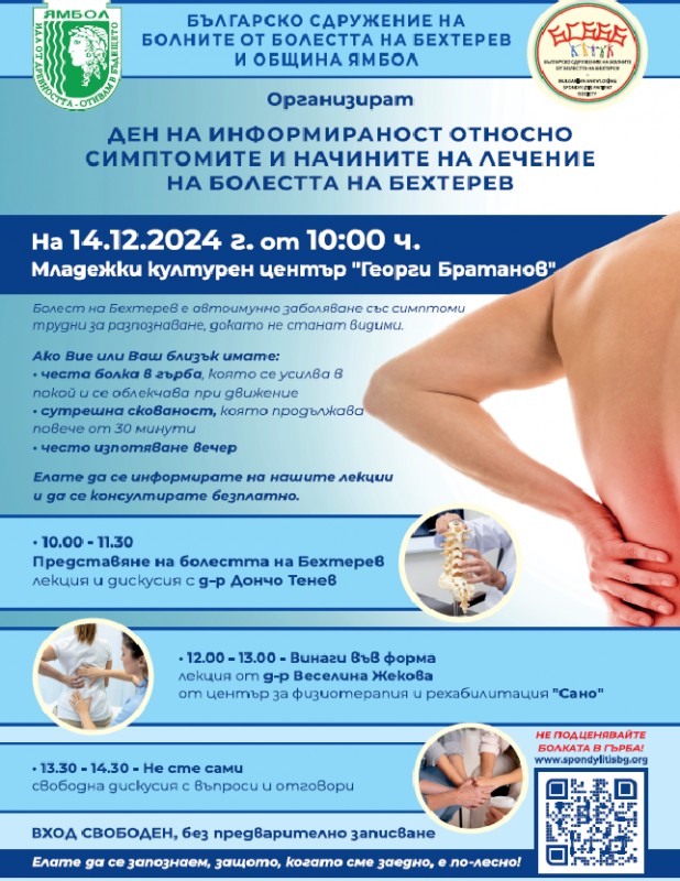 На 14 декември Българско сдружение на болните от болестта на Бехтерев /БСБББ-АС/ организира безплатна информационна среща, посветена на болестта на Бехтерев. Тя ще се проведе в Ямбол и на всеки ще може да научи какви са симптомите и начините на лечение.