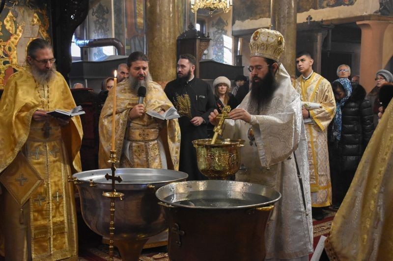 Архиереят освети кръстообразно всеки от приготвените купели, поставени в центъра на храма, и поръси множеството християни, дошли да почетат светото Богоявление и да отнесат с радост от богоявленската вода в домовете си.