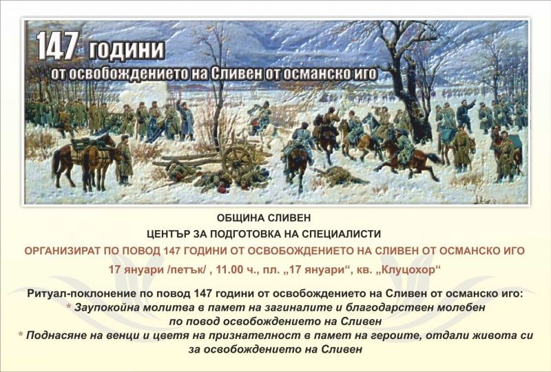 На 17 януари Сливен ще отбележи 147 години от освобождението си от османско иго. От 11 часа на площад „17 януари“ в квартал „Клуцохор“ ще се състоят заупокойна молитва в памет на загиналите и благодарствен молебен. Ще бъдат поднесени венци и цветя на признателност в памет на героите, отдали живота си за освобождението на града.