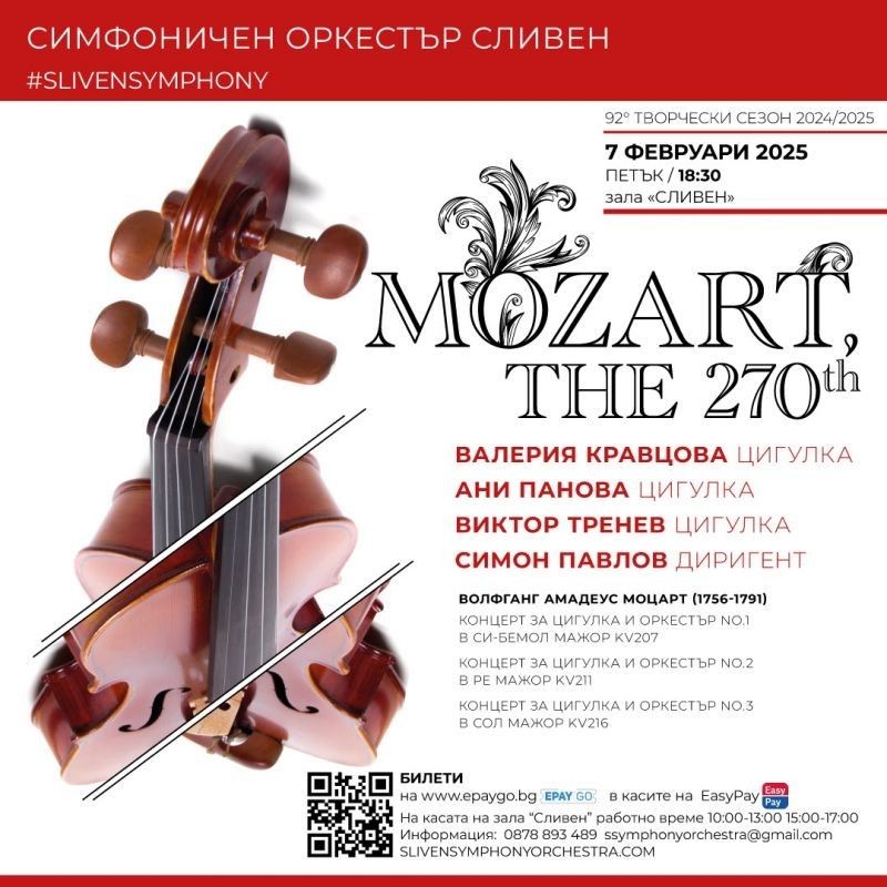 На 7 февруари Симфоничен оркестър Сливен ще бъде домакин на един чуден празник за сетивата – поредния концерт от цикъла „Млада Европа“. В центъра на вечерта отново ще бъде музиката на безсмъртния Волфганг Амадеус Моцарт, а с този концерт официално ще бъде поставено началото на поредица събития, посветени на предстоящата 270 годишнина от рождението на композитора.