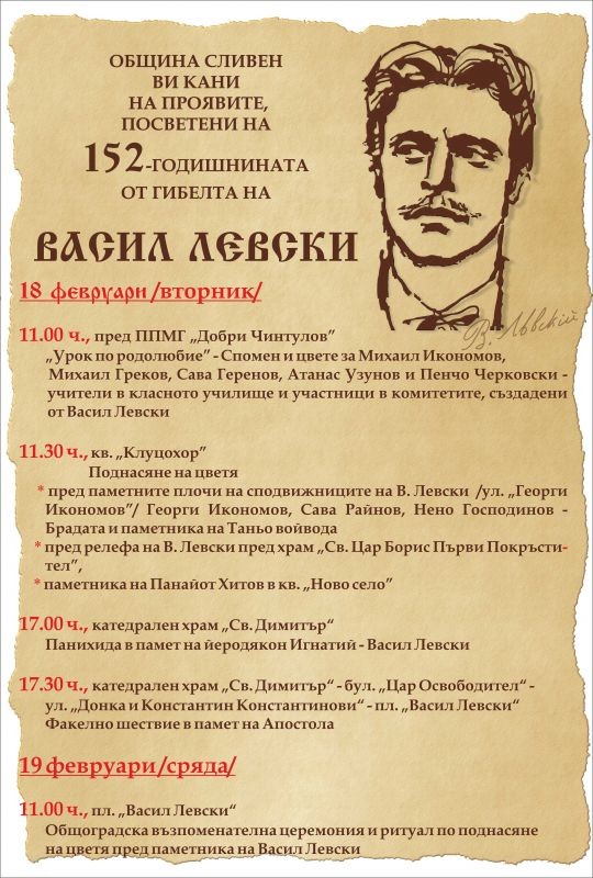 С редица прояви на 18 и 19 февруари Община Сливен ще отбележи 152 години от гибелта на Апостола на свободата – Васил Левски. По традиция на 18 февруари в 11 часа представители на „Мати Болгария“ и ученици от Профилирана природо-математическа гимназия „Добри Чинтулов“ ще проведат „Урок по родолюбие” – Спомен и цвете за Михаил Икономов, Михаил Греков, Сава Геренов, Атанас Узунов и Пенчо Черковски – учители в класното училище и участници в комитетите, създадени от Васил Левски. Събитието ще се състои пред плочата, поставена на фасадата на училището. След това участниците ще поднесат цветя пред паметните плочи на сподвижниците на Левски – Георги Икономов, Сава Райнов, Нено Господинов – Брадата и паметника на Таньо войвода, които се намират в квартал „Клуцохор“. Цветя ще бъдат поднесени и пред релефа на Дякона пред храм „Св. Цар Борис Първи Покръстител”, както и на паметника на воеводата Панайот Хитов в квартал „Ново село”, в чиято чета Васил Левски е бил знаменосец.