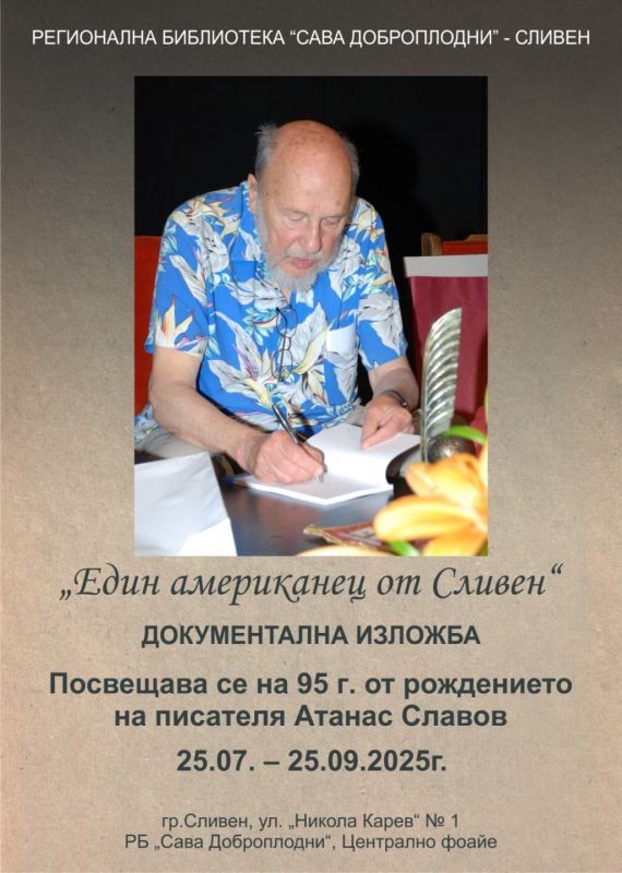 В РЕГИОНАЛНА БИБЛИОТЕКА ‘САВА ДОБРОПЛОДНИ”- СЛИВЕН СЕ ОТКРИВА ДОКУМЕНТАЛНА ИЗЛОЖБА „ЕДИН АМЕРИКАНЕЦ ОТ СЛИВЕН“, ПОСВЕТЕНА НА 95-ГОДИШНШНАТА ОТ РОЖДЕНИЕТО НА ПИСАТЕЛЯ АТАНАС СЛАВОВ
