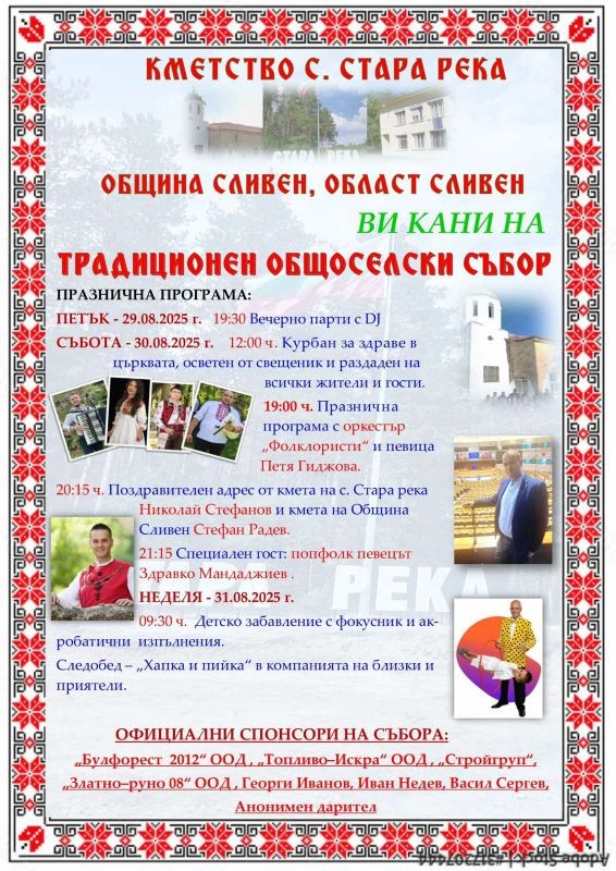 Палитра от събития за малки и големи подготвя сливенското село Стара река по случай ежегодния си общоселски събор. Той ще се проведе на 30 и 31 август, като началото ще бъде дадено още на 29 август, петък. Жители и гости на селото ще имат възможност да се включат в петъчното вечерно диджейско парти. То ще започне от 19.30 ч.