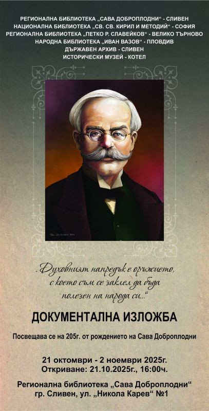 На 21 октомври, от 16:00 часа, в централното фоайе на Регионална библиотека „Сава Доброплодни“ - Сливен ще бъде открита документалната изложба „Духовният напредък е оръжието, с което съм се заклел да бъда полезен на народа си…“ посветена на 205 години от рождението на Сава Доброплодни - една от най-значимите фигури на Българското възраждане - изтъкнат възрожденски учител, заслужил педагог, плодовит книжовник, талантлив преводач и публицист, самоотвержен борец за църковна независимост, активен читалищен деец и общественик, родоначалник на Българския театър.