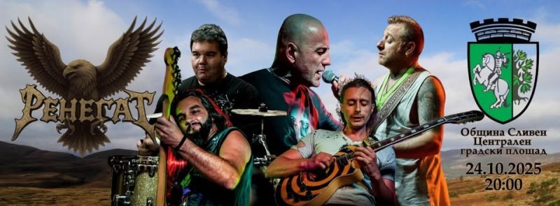 Рок група „РЕНЕГАТ“ се качва на сливенска сцена този петък, 24 октомври. Събитието е част от програмата на Общината за Димитровден – празника на Сливен. „С новото си попълнение Джимара и още по-брутално звучене, групата излиза на сцената за първи път в новия си състав“, информират на официалната фейсбук страница на „РЕНЕГАТ“.