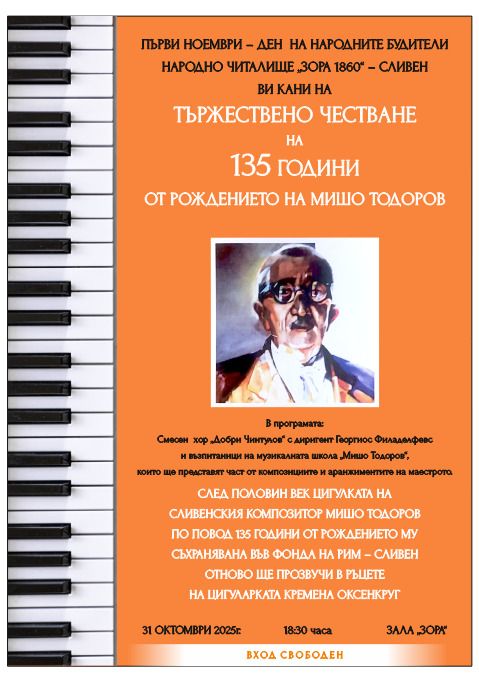 Вечерта ще бъде изцяло посветена на творчеството на Мишо Тодоров – програмата включва негови произведения, които ще прозвучат отново на сцената на родния му град.