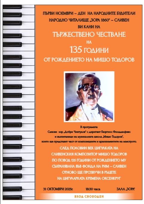 В навечерието на Деня на народните будители – 1 ноември, в Сливен ще отбележи 135 години от рождението на сливенския композитор, диригент, музикален педагог и общественик Мишо Тодоров.