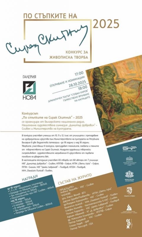 Изложба с отличени творби от Втория национален конкурс „По стъпките на Сирак Скитник“ беше открита в галерия „Нова“ при Националната художествена гимназия „Димитър Добрович“ – Сливен. Проявата се организира за втора поредна година от Министерството на културата, Националната художествена гимназия „Димитър Добрович“, Община Сливен, Българското национално радио, Художествената галерия „Димитър Добрович“ и представителството на Съюза на българските художници в Сливен.